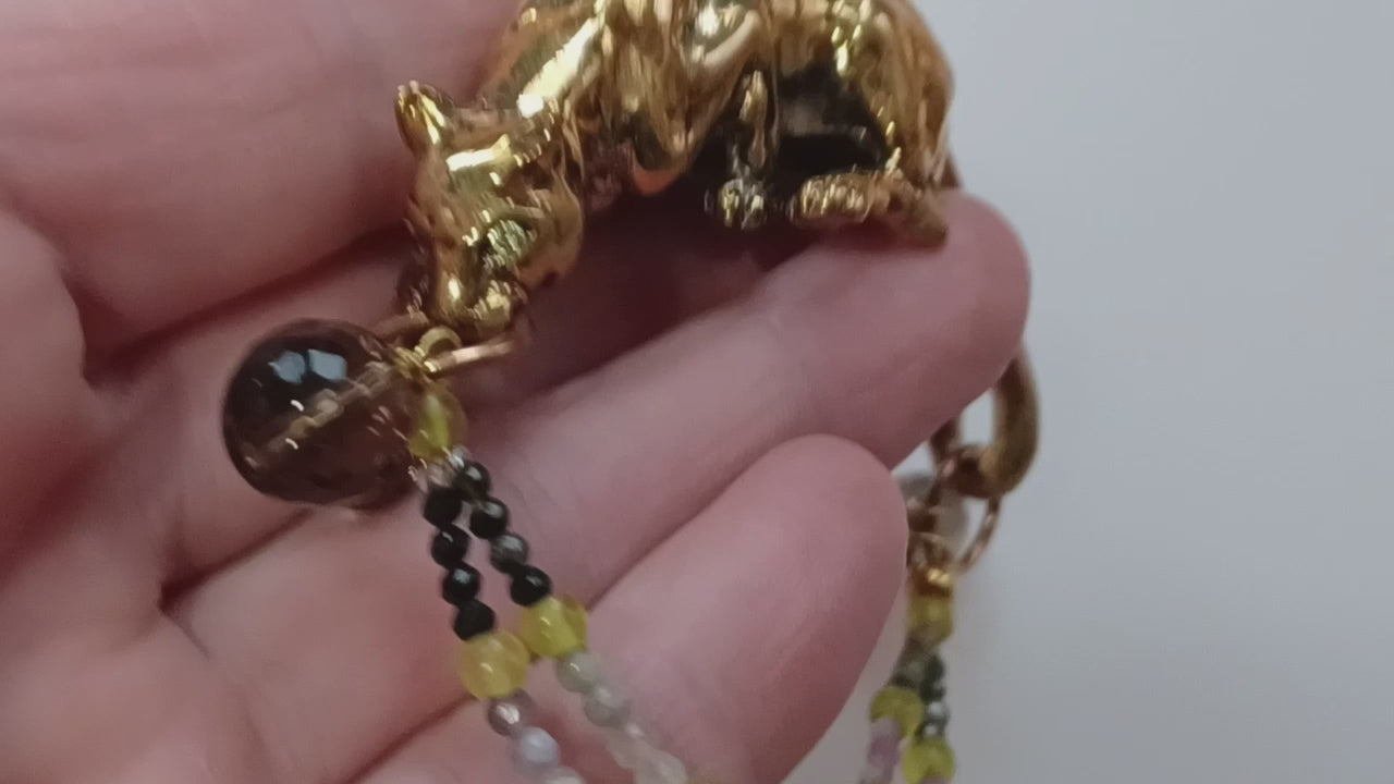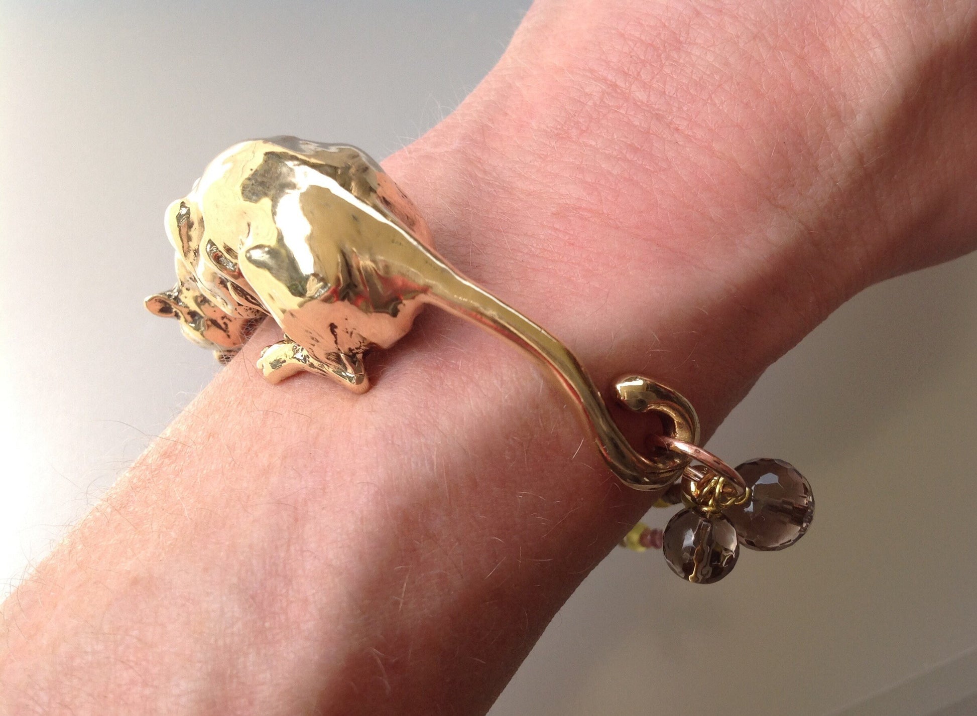 Bronze crouching Cougar Jaguar Leopard Cat stone eyes Tourmaline gemstone beads sculpture bracelet artist original.