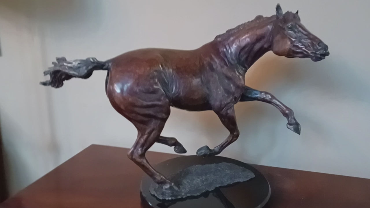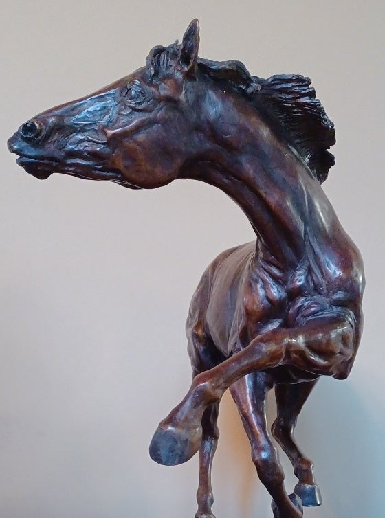 "Unhinged" was created in 2022, and was exhibited at the American Academy of Equine Art Fall Show , where it won the Founder's Award for Sculpture. It is a horse switching directions of her gallop in mid stride, creating a fantastic frozen moment rarely depicted in horse sculpture.