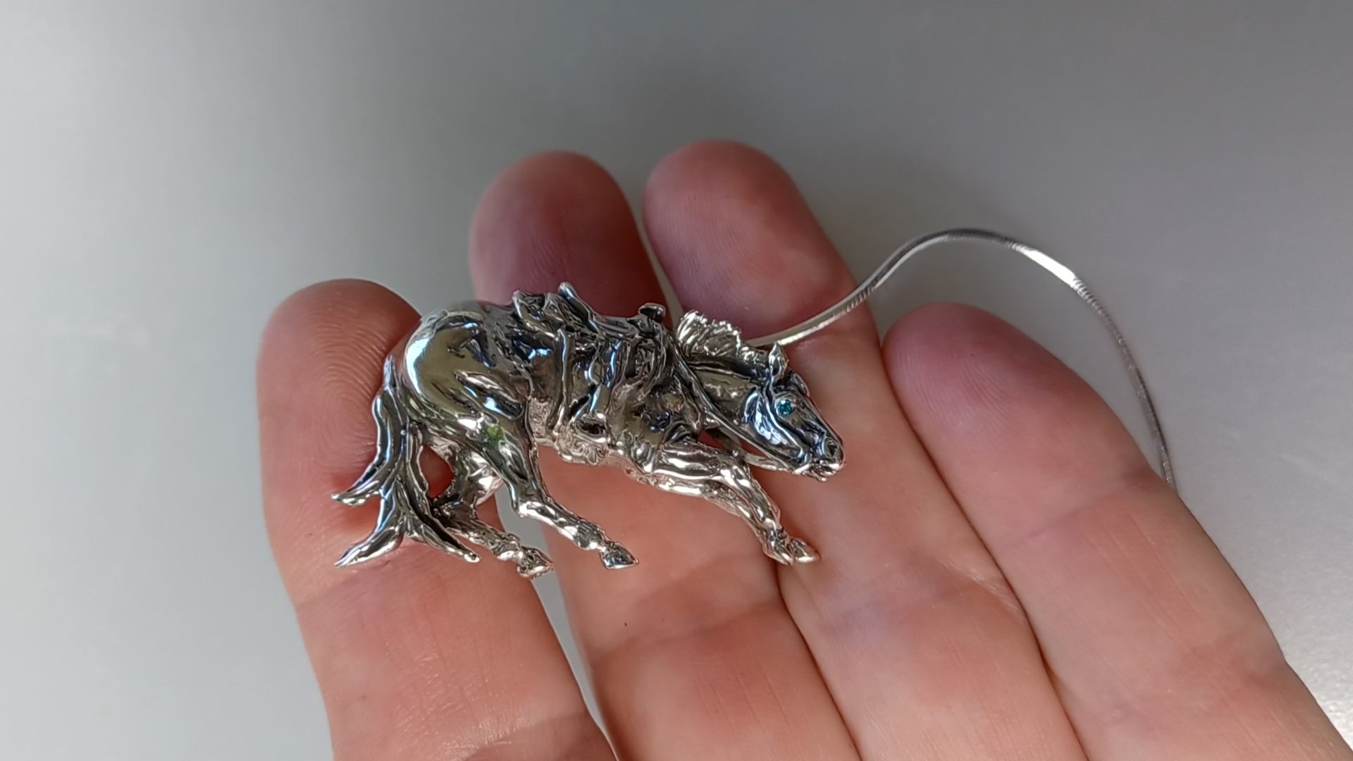 This pendant comes with an 18" heavy fancy cut sterling silver chain with a lobster claw clasp. The chain is the perfect weight for the large cutting horse pendant.