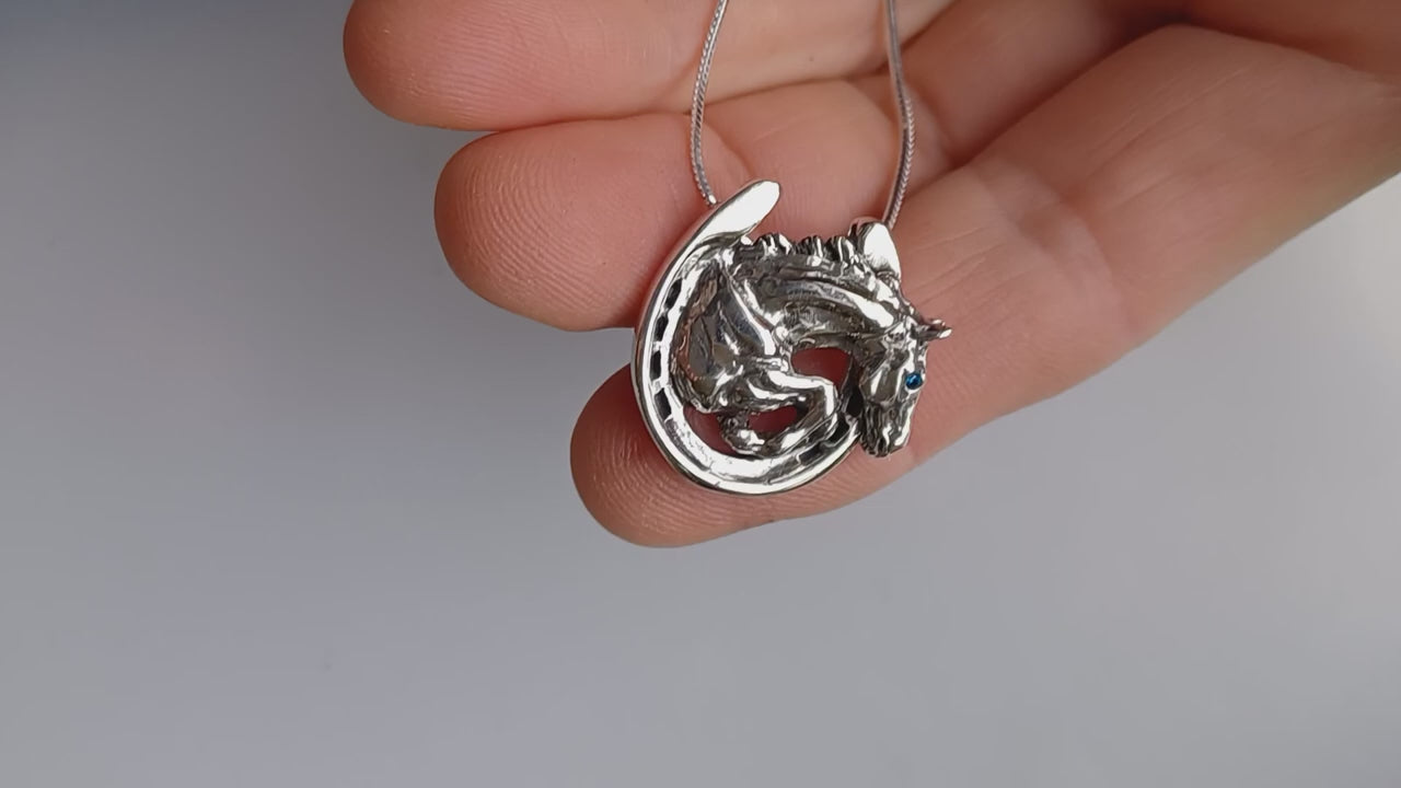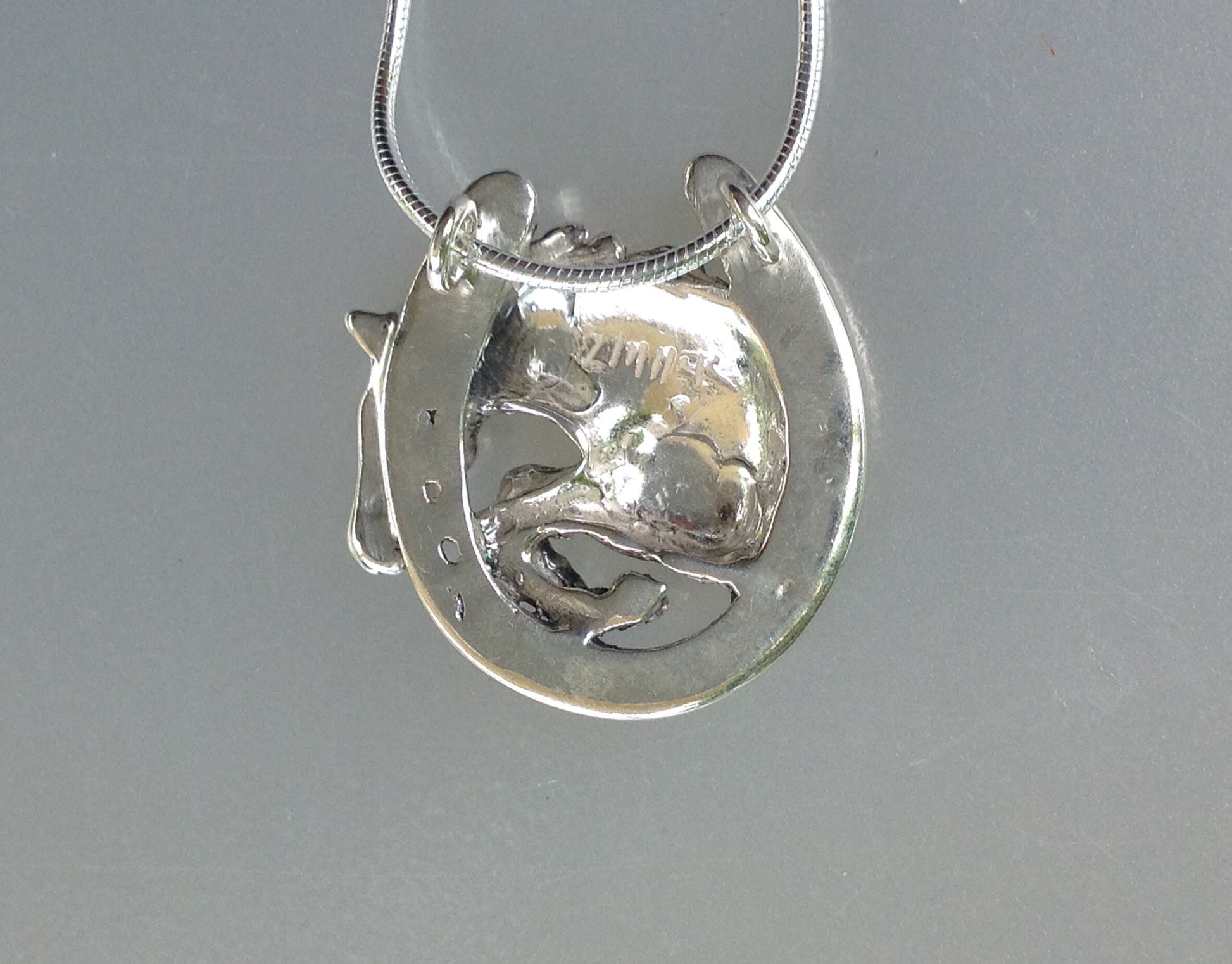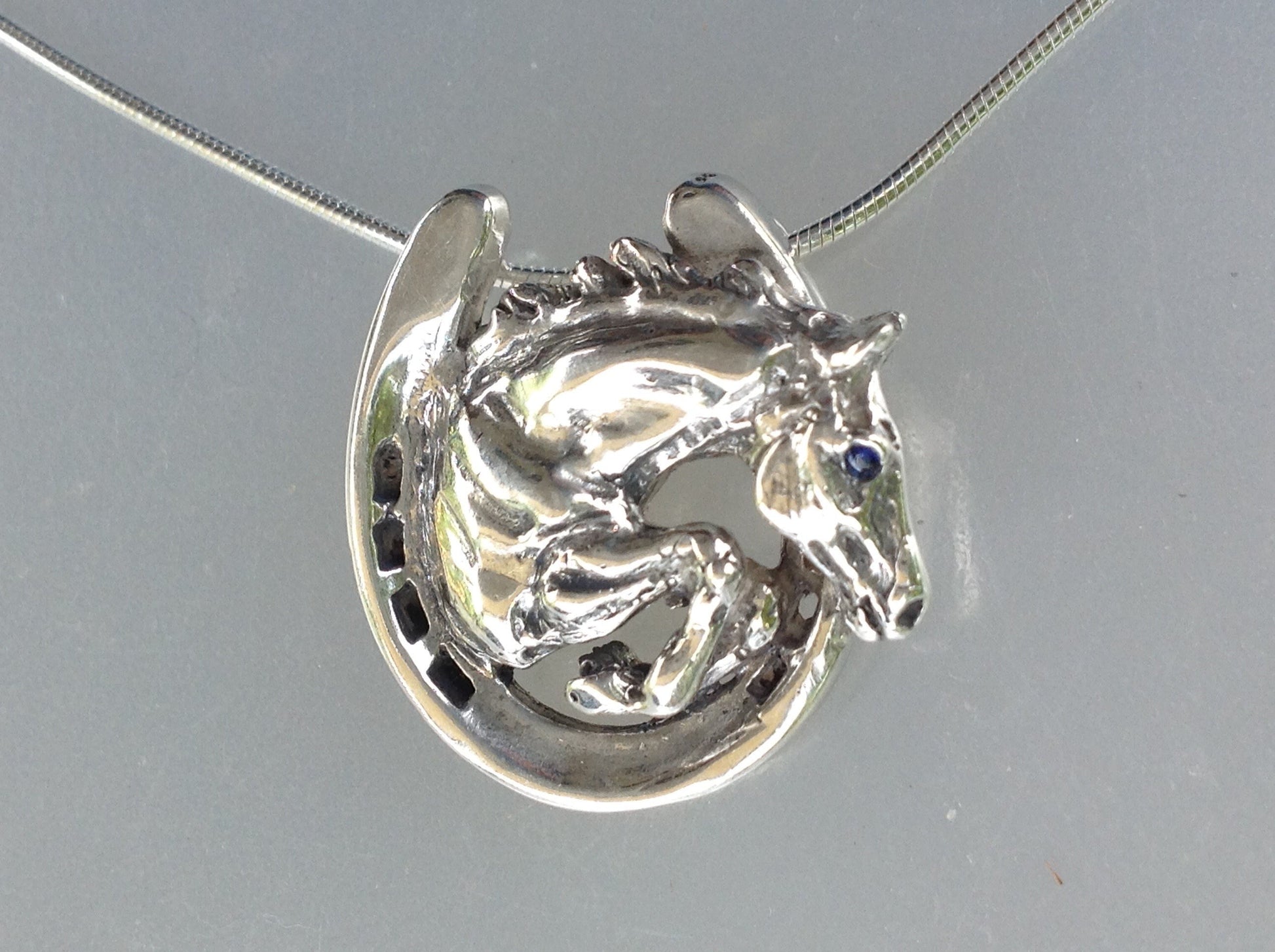 Jumper horse in horseshoe pendant and chain. Stone set eye. Sterling Silver Forge Hill Sculpture horse jewelry Zimmer