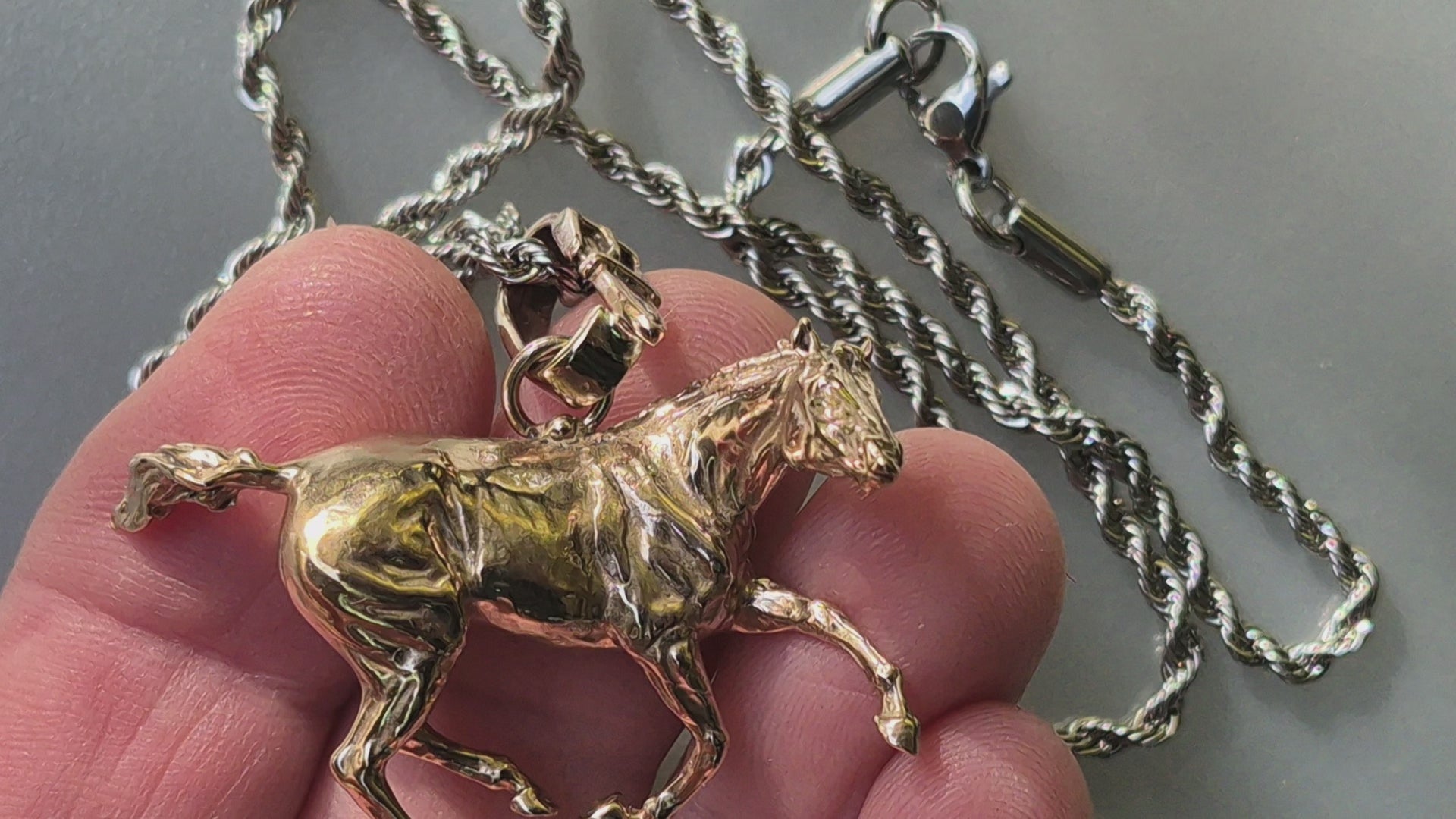 Galloping Mare pendant and chain cast in real silicon bronze. I am offering the bronze pendants as an unusual alternative. Same workmanship, same labor, they are just cast in a less expensive metal and sold on stainless steel chains, which are very pretty!