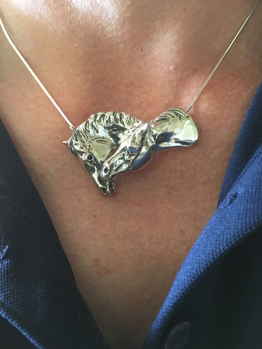 Sterling Silver nuzzling horses pendant and chain with your choice of stone eyes. Zimmer equestrian jewelry