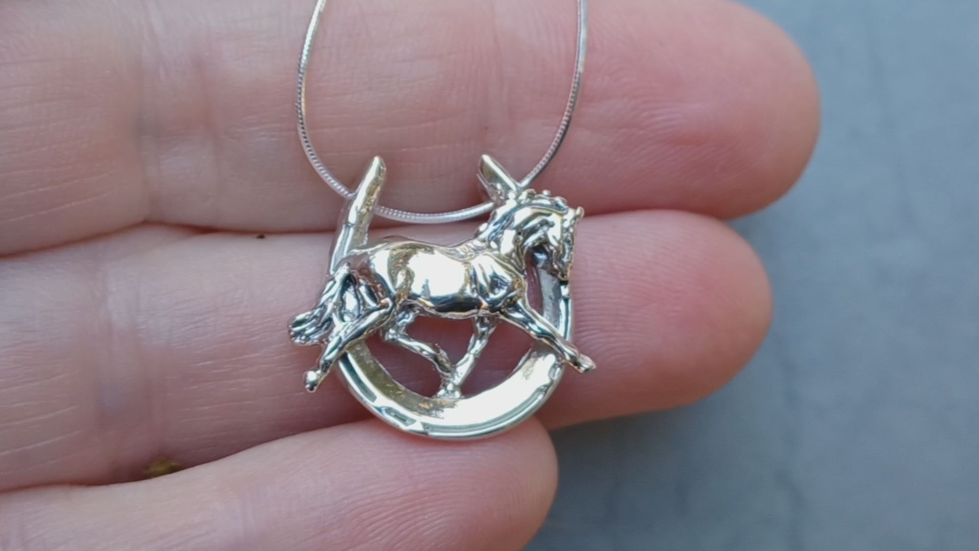 Trotting Horse in horseshoe pendant & chain sterling silver Forge Hill Sculpture Zimmer jewelry